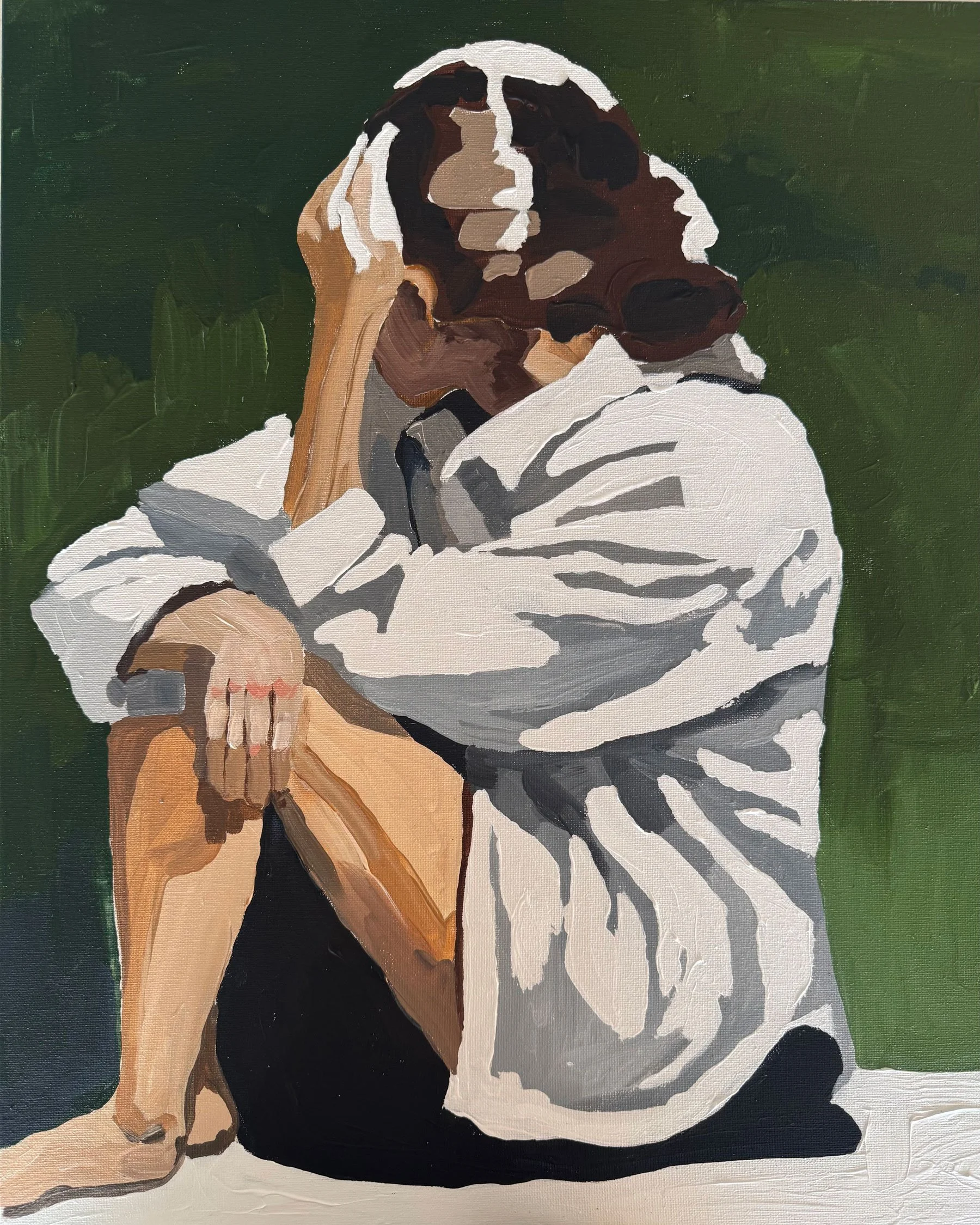 “In This Shirt” is a visual diary of the everyday and the absurd, the tender and the ridiculous. From curb side chaos and chicken pox parties to hospital waiting rooms and soggy self reflection, each painting captures a scene from life’s wardrobe — oversized, mismatched, occasionally damp, but always worn with feeling.
